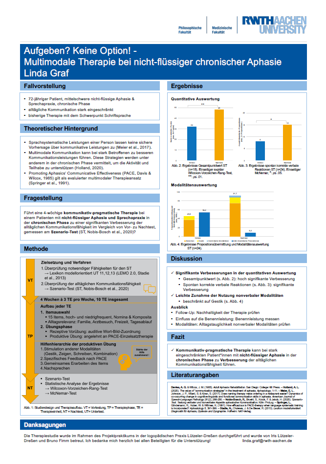 Die digitale Posterpräsentation wird wie gewohnt kurzweilig und kompetent von PD Annette Fox-Boyer PhD und Prof. Dr. Walter Huber moderiert. Die Poster werden am Freitag, 23. Mai 2025 zwischen 10:45 und 12:15 Uhr sowie Samstag, 24. Mai 2025 zwischen 9:00 und 10:30 Uhr jeweils im Borgward Saal vorgestellt.